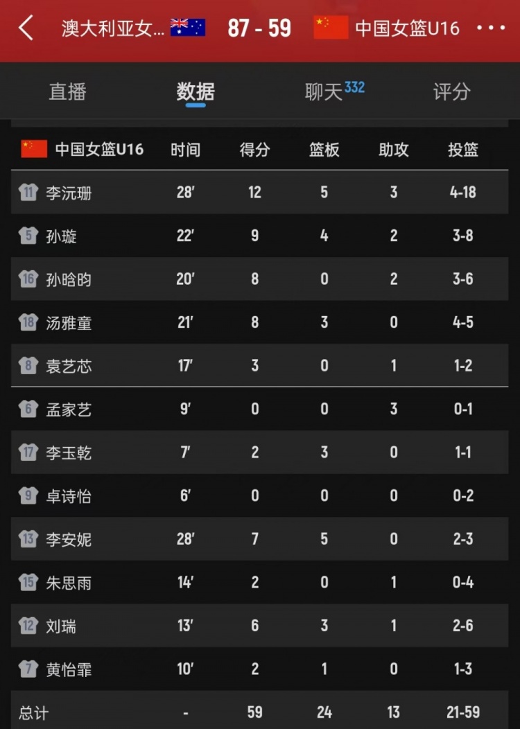 9月27日讯 U16女篮亚洲杯半决赛,中国队58-87不敌澳大利亚队。此役中国队球员李沅珊表现不佳,打了28分钟18投仅...