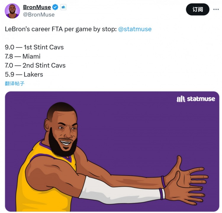9月27日讯 今天美媒BronMuse晒出了詹姆斯生涯四个阶段的场均罚球出手数,具体如下:骑士1.0时期:9次热火时期:...