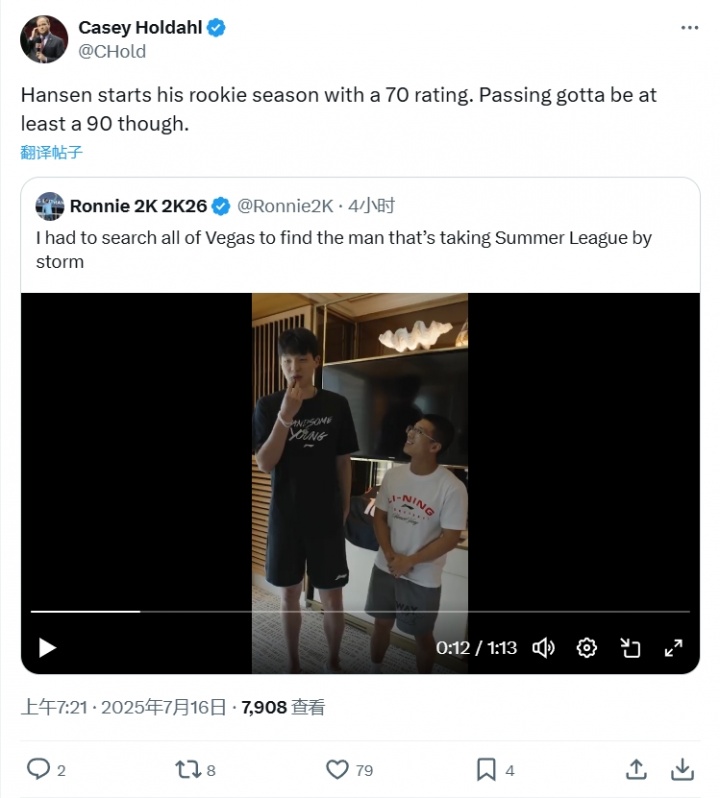 07月16日讯 NBA官方发布动态,2K主管罗尼和杨瀚森见面,并亲自揭晓杨瀚森2K26初始能力值:70!拓记Casey ...