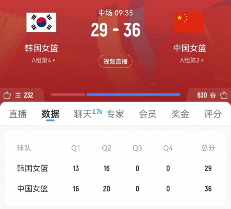 半场战报-张子宇10分 韩旭6+5 中国女篮领先韩国女篮7分