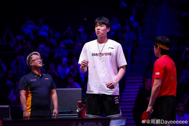7月11日讯 乒乓球WTT美国大满贯男单1/8决赛,中国选手王楚钦对阵韩国选手李尚洙。本场比赛,杨瀚森来到现场为比赛挑边...