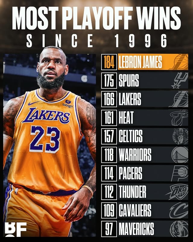 美媒BF晒图,詹姆斯季后赛胜场数184场,超越1996年以来所有的球队,球队里排名前五的是:马刺175场、湖人166场、...
