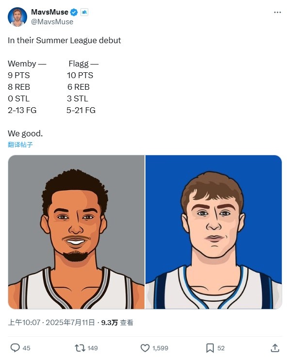 7月11日讯 在今天的夏联比赛中,独行侠87-85险胜湖人。独行侠自媒体晒出弗拉格和文班亚马的夏联首秀数据对比,并写道:...
