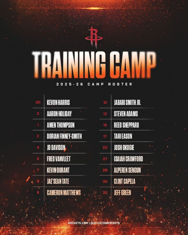 火箭公布训练营名单:杜兰特&申京领衔 范弗里特在列 共18人