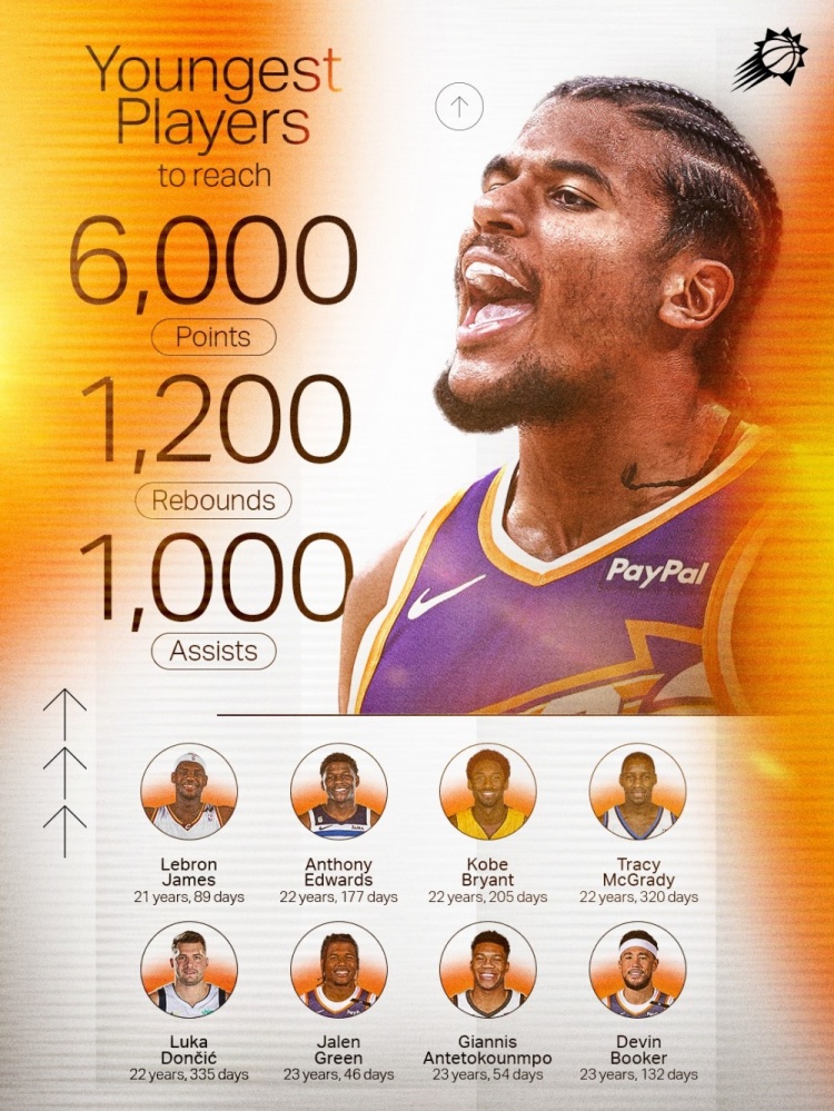 7月11日讯 太阳官方晒出一张关于“拿到6000分+1200篮板+1000助攻最年轻的8位球员”数据图,并配文写到:“跻...
