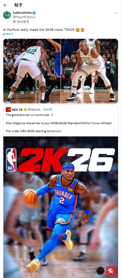 07月09日讯 NBA官方今天凌晨宣布,雷霆球星亚历山大成为NBA2K26的封面人物。CelticsGlobe转发推文并...