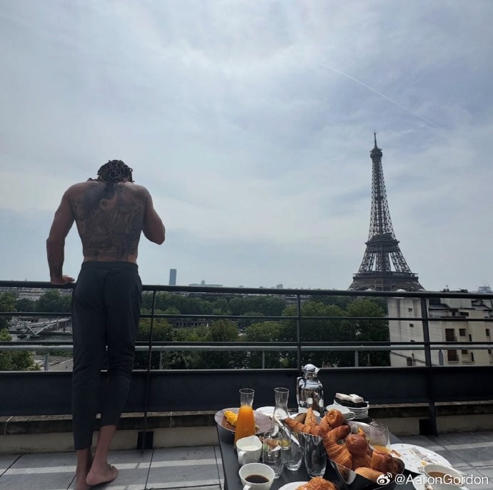 7月8日讯 今天,掘金球星阿隆-戈登更新了个人微博。戈登晒出自己在巴黎的照片,他赤裸上身遥望埃菲尔铁塔,身旁摆放着丰盛的...