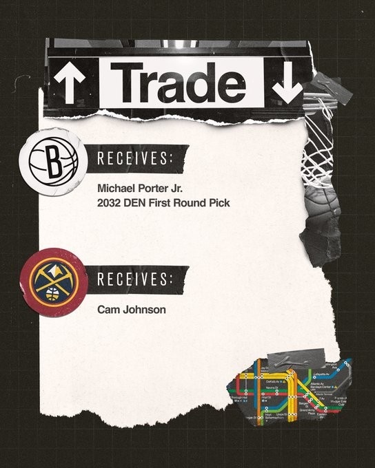 7月9日讯 篮网官方宣布,球队和掘金的交易正式达成。这笔交易中,篮网送出卡梅隆-约翰逊,得到小迈克尔-波特和2032年掘...