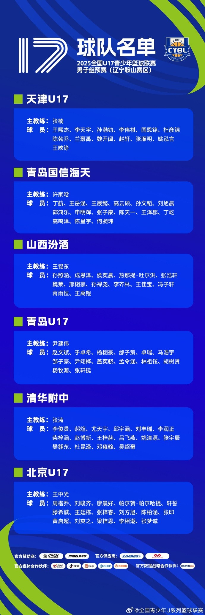 2025年全国U17青少年篮球联赛男子组预赛(辽宁鞍山赛区)名单公布。...