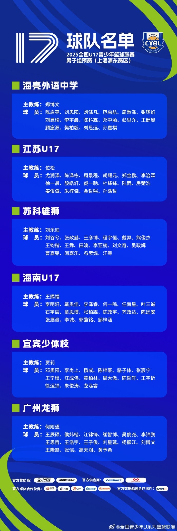 2025年全国U17青少年篮球联赛男子组预赛(上海浦东赛区)名单公布。...