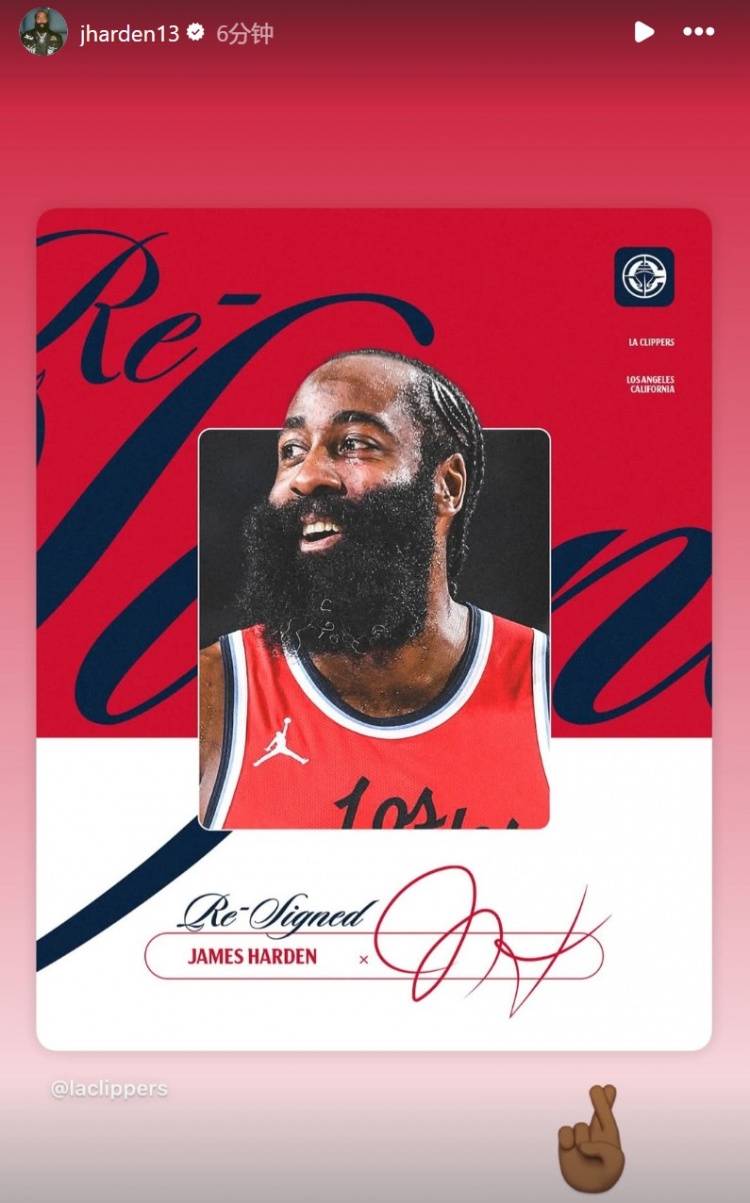 7月7日讯 快船官方宣布,已经和11届全明星詹姆斯-哈登完成续约。哈登在INS上转发了官方的相关报道,并配表情包:🤞🏾。...