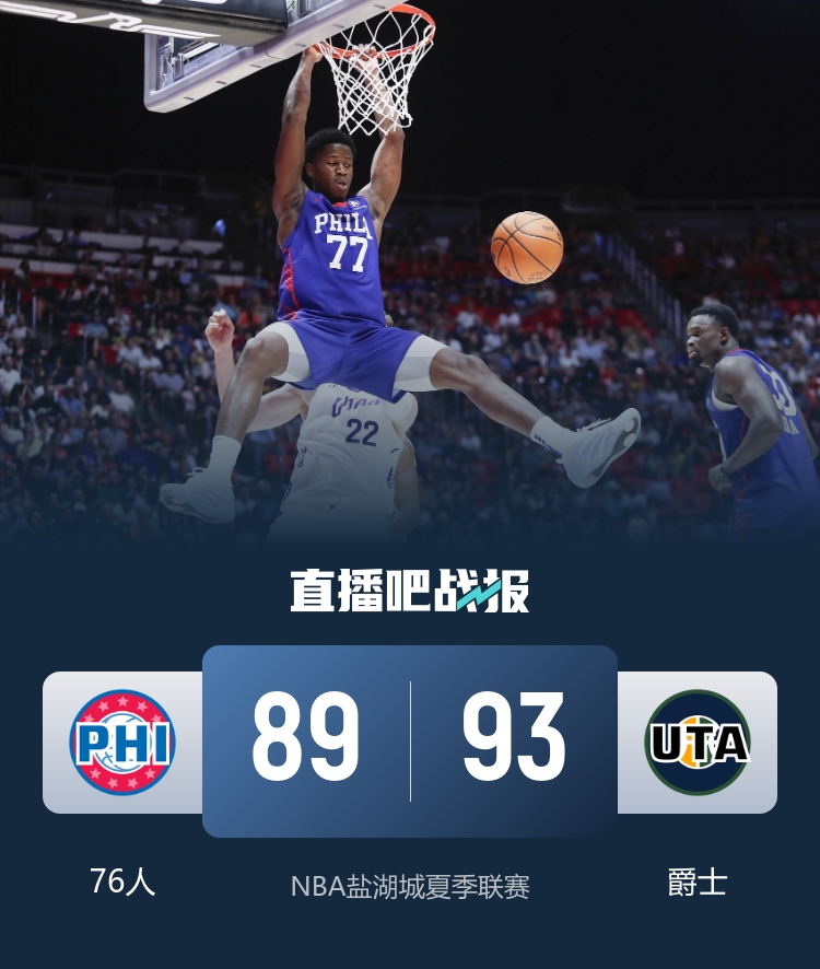 🏀盐湖城夏联-埃奇库姆28+10 贝利13中3 76人憾负爵士