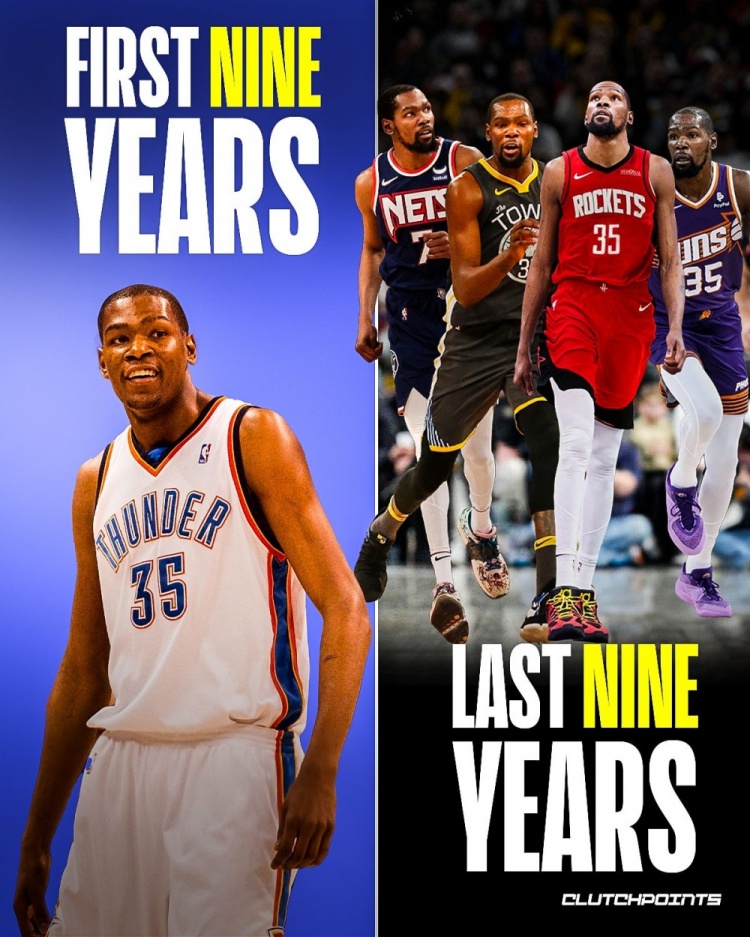 杜兰特生涯前9年效力于雷霆 近9年分别效力勇士篮网太阳火箭