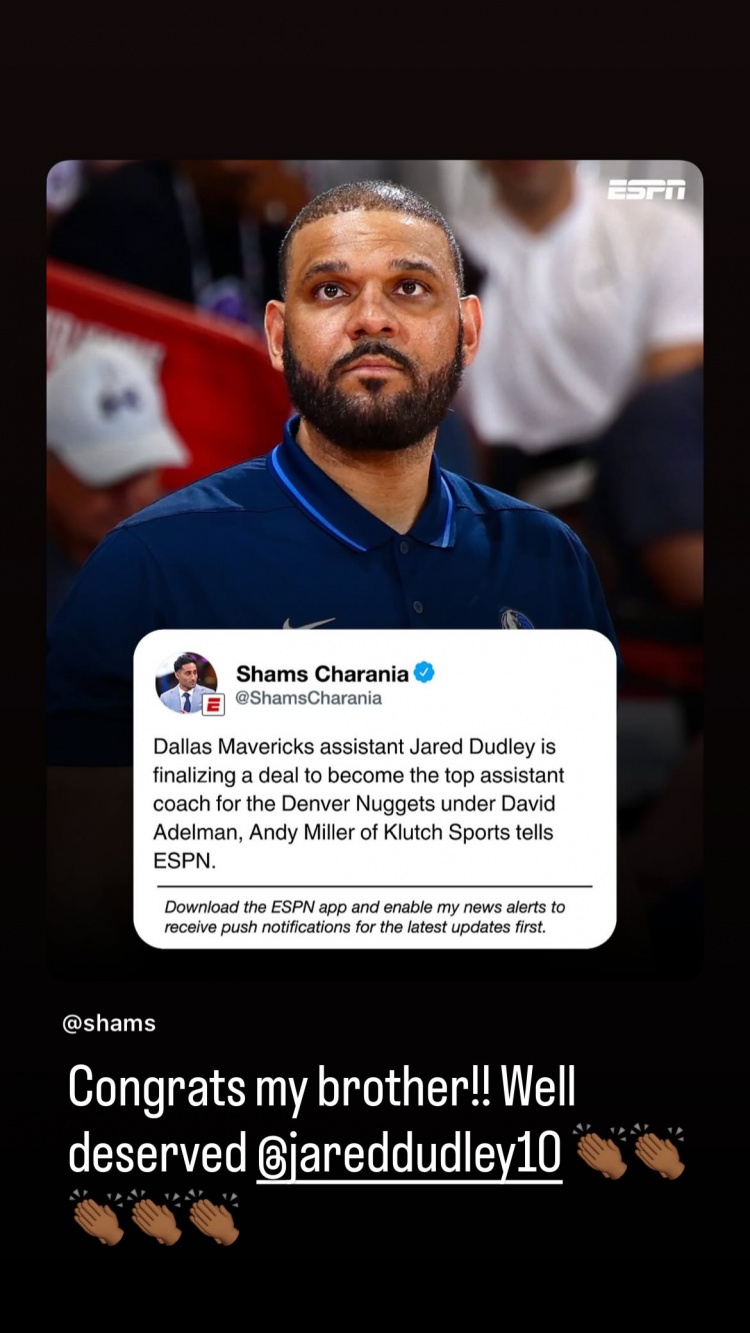 詹姆斯祝贺杜德利上任掘金助教:恭喜我的兄弟!实至名归👏🏾