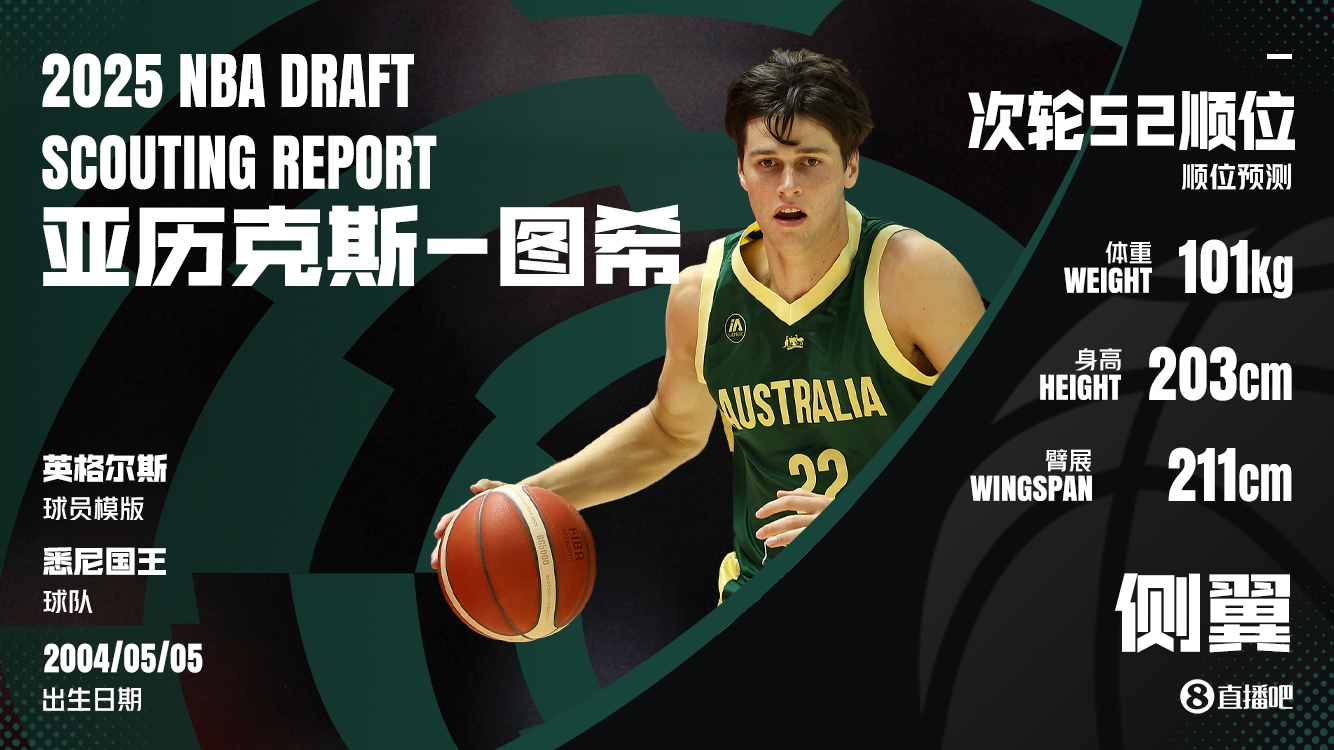 姓名:亚历克斯-图希(Alex Toohey)出生日期:2004年5月5日位置:侧翼球队:NBL悉尼国王身高:6尺8(2...