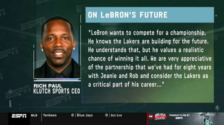 7月1日讯 今日,ESPN湖人随队记者Dave McMenamin在电视节目中进一步报道了在詹姆斯执行球员选项后,其经纪...