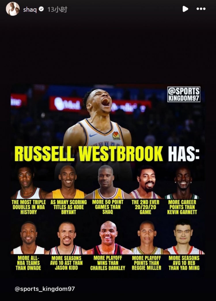 6月29日讯 今天,NBA名宿奥尼尔转发了一则关于威少多项数据荣誉的报道,详情如下:1、历史三双王2、得分王数量和科比一...