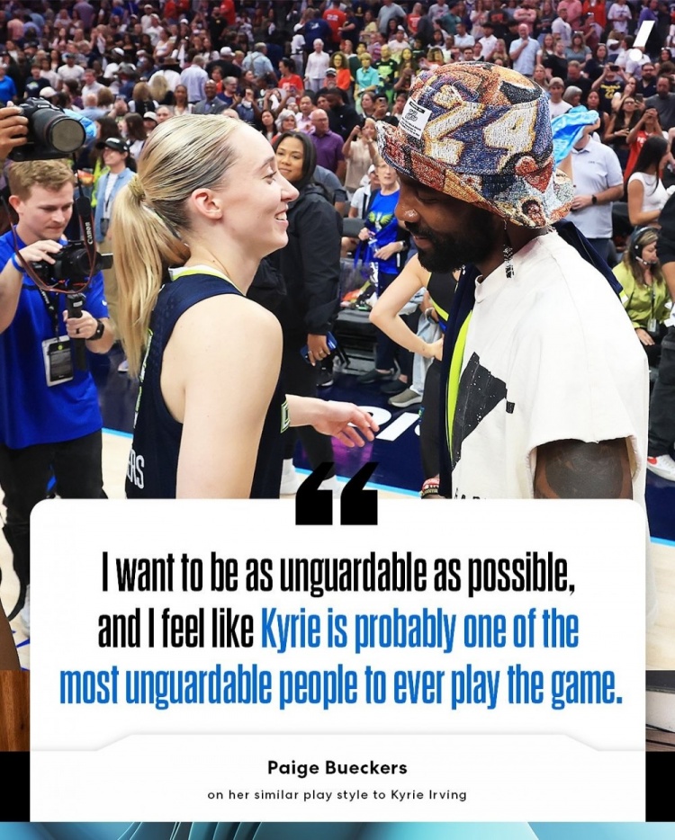 6月28日讯 WNBA常规赛,飞翼主场86-94不敌狂热。在本场比赛中,独行侠球星欧文现场为飞翼状元秀佩奇助威,赛后二人...