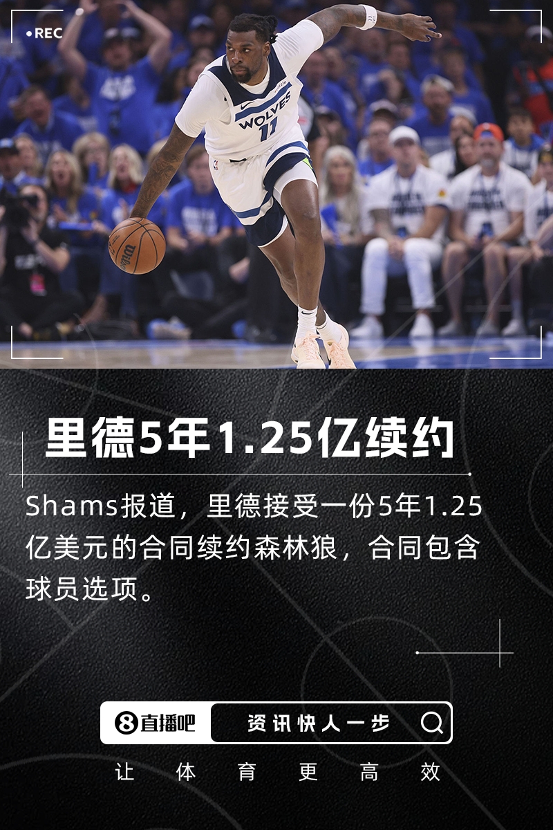 猛将💥Shams:里德5年1.25亿美元续约森林狼!