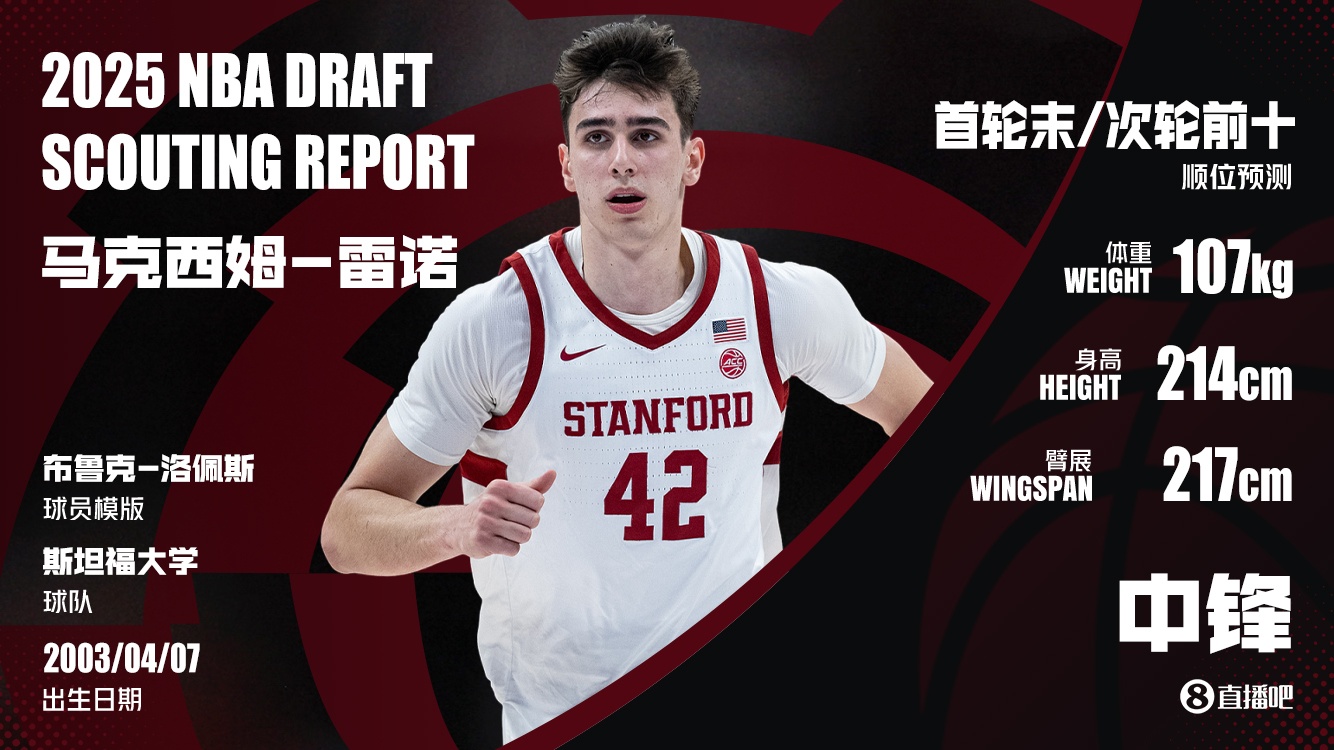 06月27日讯 NBA选秀大会次轮,国王用42号签选中斯坦福大学的法国中锋雷诺。雷诺24-25赛季(大四),出战35场,...