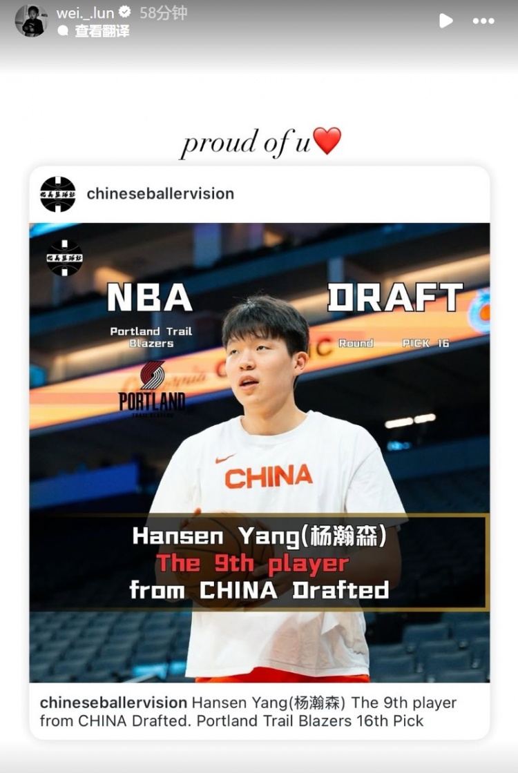 6月26日讯 NBA选秀大会,中国球员杨瀚森在首轮第16顺位被选中加盟开拓者。辽宁队球员张镇麟发博写道:“二十年开拓者老...