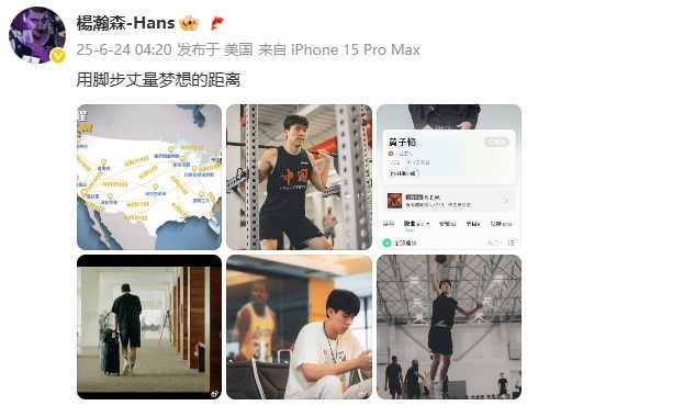 06月24日讯 正在美国准备NBA选秀的杨瀚森发博,回顾目前为止的试训经历。杨瀚森晒出多张照片,并写道:“用脚步丈量梦想...
