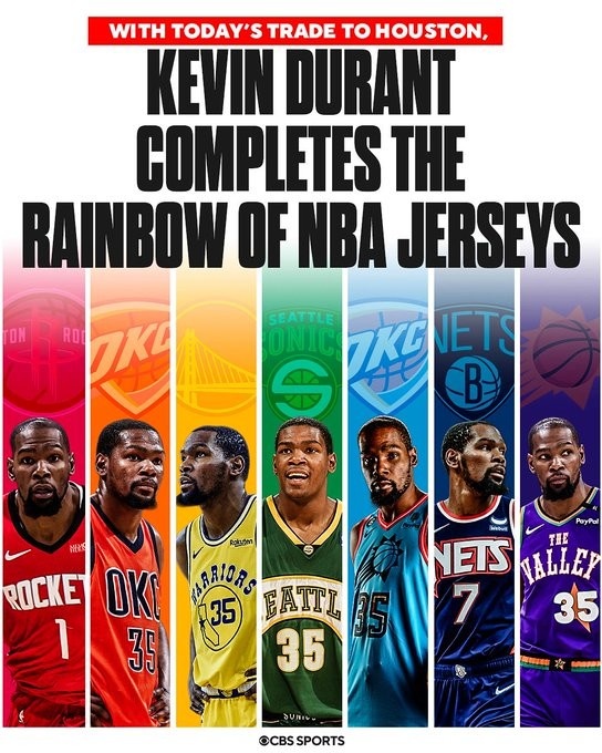 美媒晒图:杜兰特已经集齐七色球衣 你最喜欢哪一种颜色?