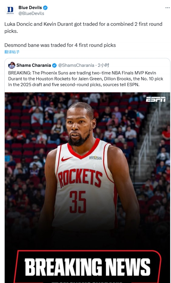 KD加盟!球队名宿发推:新赛季火箭将夺得总冠军🏆