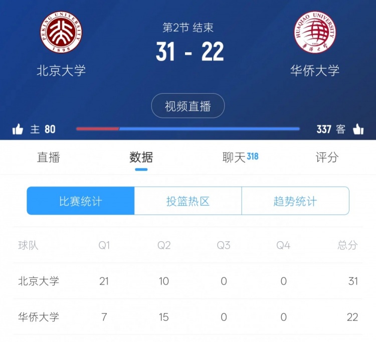 悬念再起!华侨大学次节反打一波15-10 半场战罢22-31落后北大9分