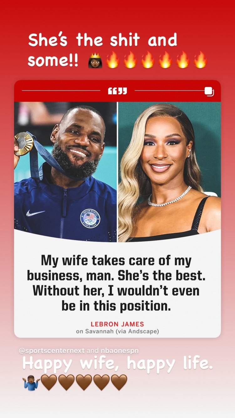 9月25日讯 今日,湖人前锋詹姆斯更新了Instagram Story动态。媒体ESPN转发了詹姆斯多年来称赞妻子的言论...