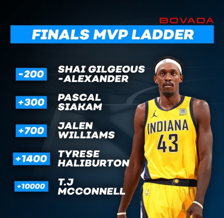 6月22日讯 明天上午8点,雷霆和步行者的总决赛抢七大战将正式开打。今天,博彩网站更新了总决赛MVP的赔率,亚历山大最被...