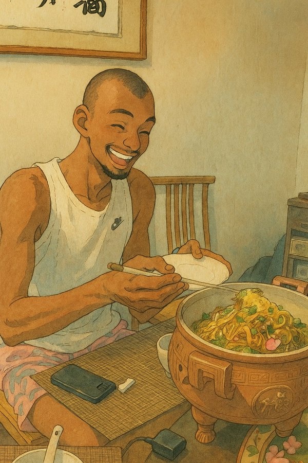 吉普力风格生成🥢文班亚马在嵩山吃水席 笑容满面大快朵颐🤤