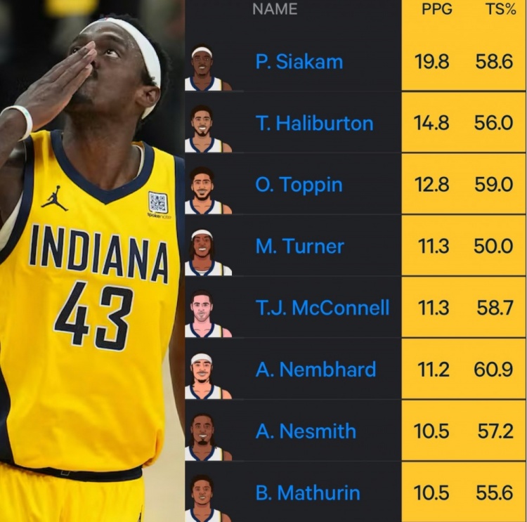 步行者总决赛前6战无人场均得分超20分 但有8人场均得分上双