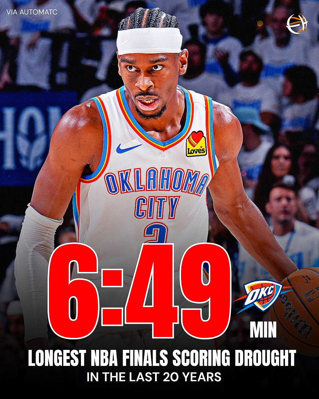 06月20日讯 NBA总决赛G6,步行者108-91大胜雷霆,将比赛拖入抢七。据统计,本场比赛雷霆一度长达6分49秒没有...