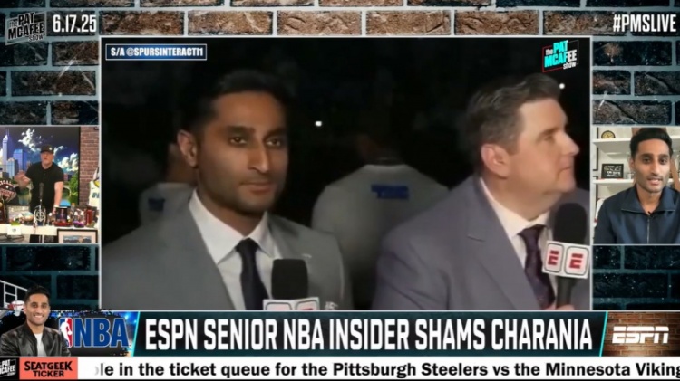 6月18日讯 今天,名记Shams在边线时解释了他此前在做直播节目时奇怪的眼神。“这是我第一次上ESPN赛前的《Hoop...