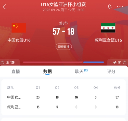 9月24日讯 U16女篮亚洲杯小组赛,中国队对阵叙利亚。比赛三节结束,中国队57-18大比分领先对手。在第三节单节比赛中...
