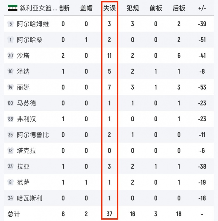 比全场得分还多!叙利亚全队高达37个失误&12人出战11人有失误