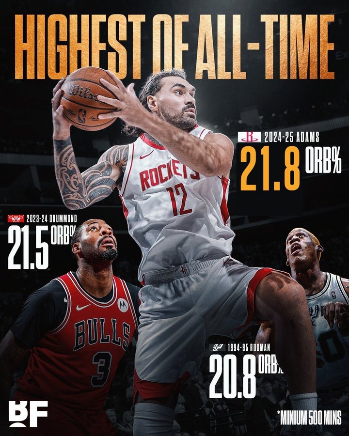 3年3900万续约火箭~亚当斯本赛季进攻篮板率高达21.8% 创历史纪录