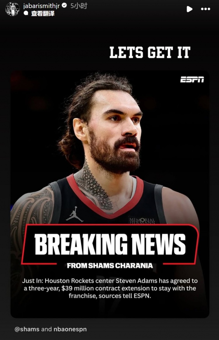 亚当斯3年3900万提前续约火箭 小贾巴里转发送祝福:让我们冲吧