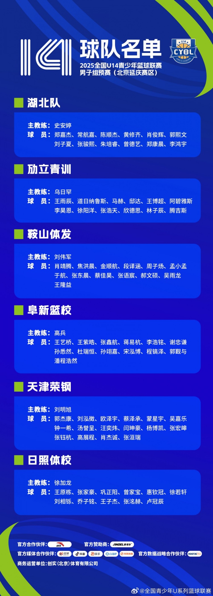 【U14男子组预赛参赛球员名单】6月12日-29日,2025全国U14青少年篮球联赛男子组预赛将分别在浙江湖州赛区和北京...