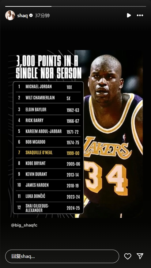 奥尼尔转发单赛季3000分俱乐部:历史共12人 无詹无库 乔丹10次