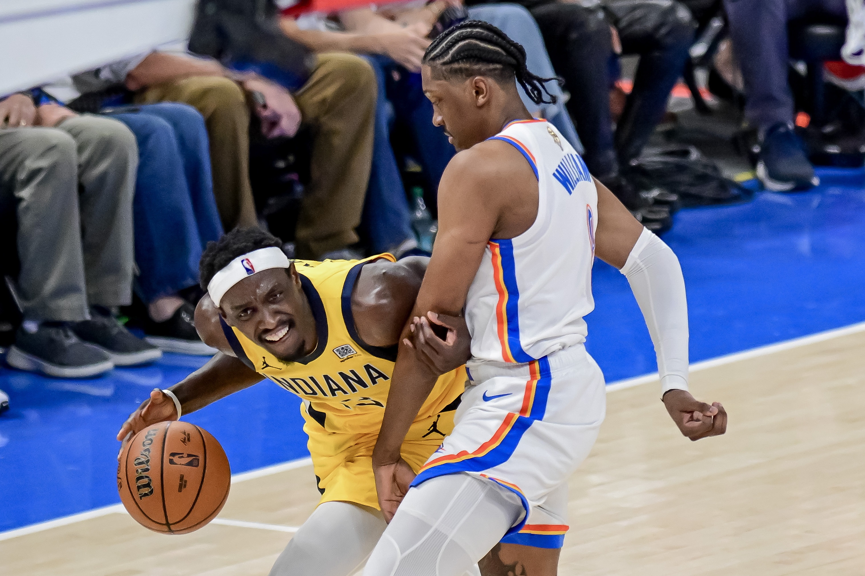 6月6日讯 NBA总决赛步行者对阵雷霆G1,步行者(1)111-110绝杀雷霆(0)。本场比赛,步行者前锋奥比-托平替...