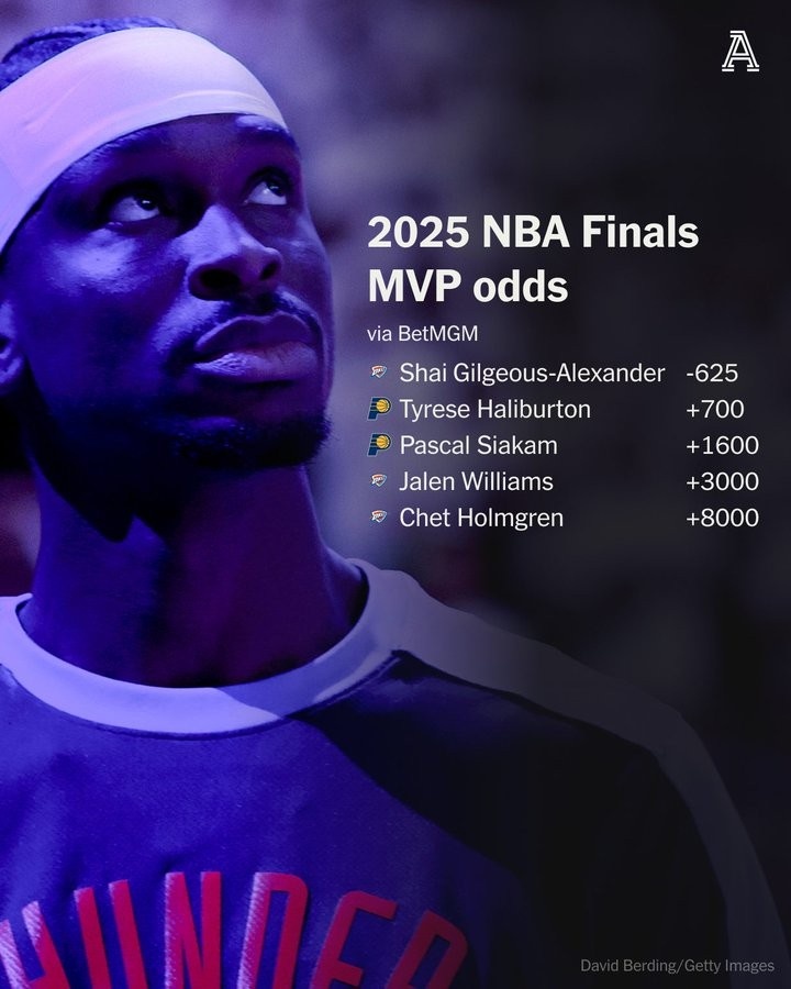 6月3日讯 NBA总决赛,雷霆将对阵步行者。博彩网站更新了系列赛FMVP的赔率:亚历山大 -625(押625若中共得72...