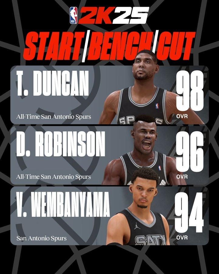 5月26日讯 今天,NBA 2K发起投票:邓肯、大卫-罗宾逊、文班亚马,这3名马刺球星首发/替补/裁一个,怎么选择?...