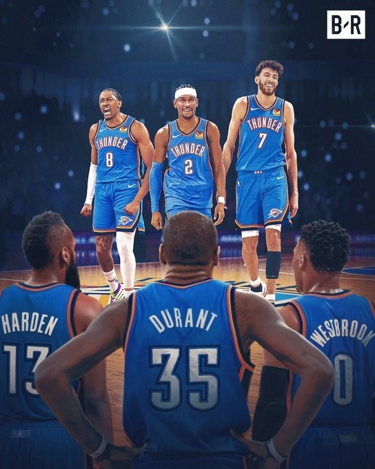 传承⚡美媒晒图:雷霆三人组在昔日三少的注视下登上总决赛舞台