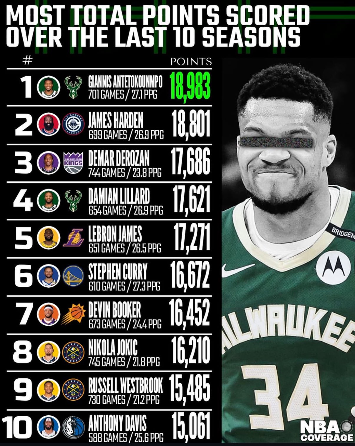 🔥近十年得分榜:字母哥压哈登第1 詹姆斯第5 库里第6 前十无KD