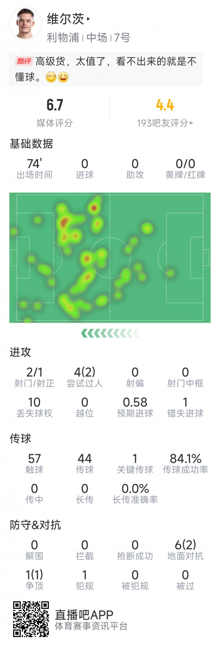 维尔茨本场数据:2射1正,2次过人,1次关键传球,评分6.7分