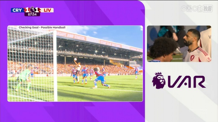 09月27日讯 英超第6轮,水晶宫vs利物浦。比赛第87分钟,基耶萨替补建功,利物浦1-1客场扳平水晶宫。VAR介入检查...