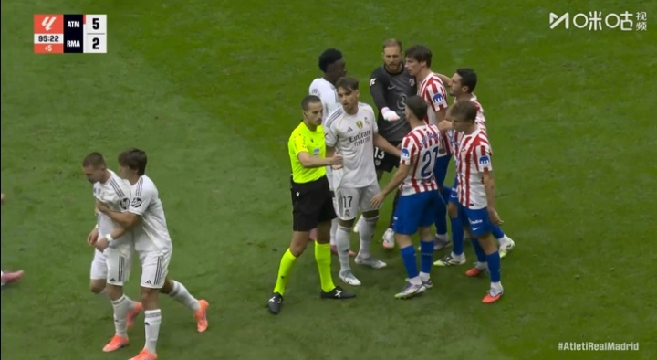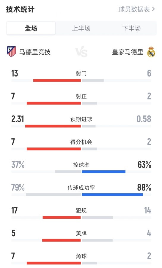 马竞5-2皇马全场:射门13-6,射正7-2,控球率37%-63%,犯规17-14