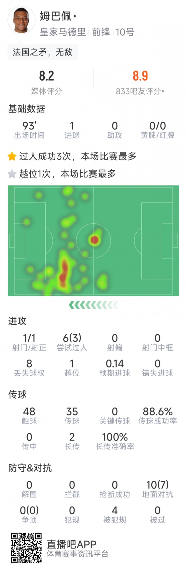 姆巴佩本场数据:1粒进球,仅1次射门,3次成功过人,11对抗8成功